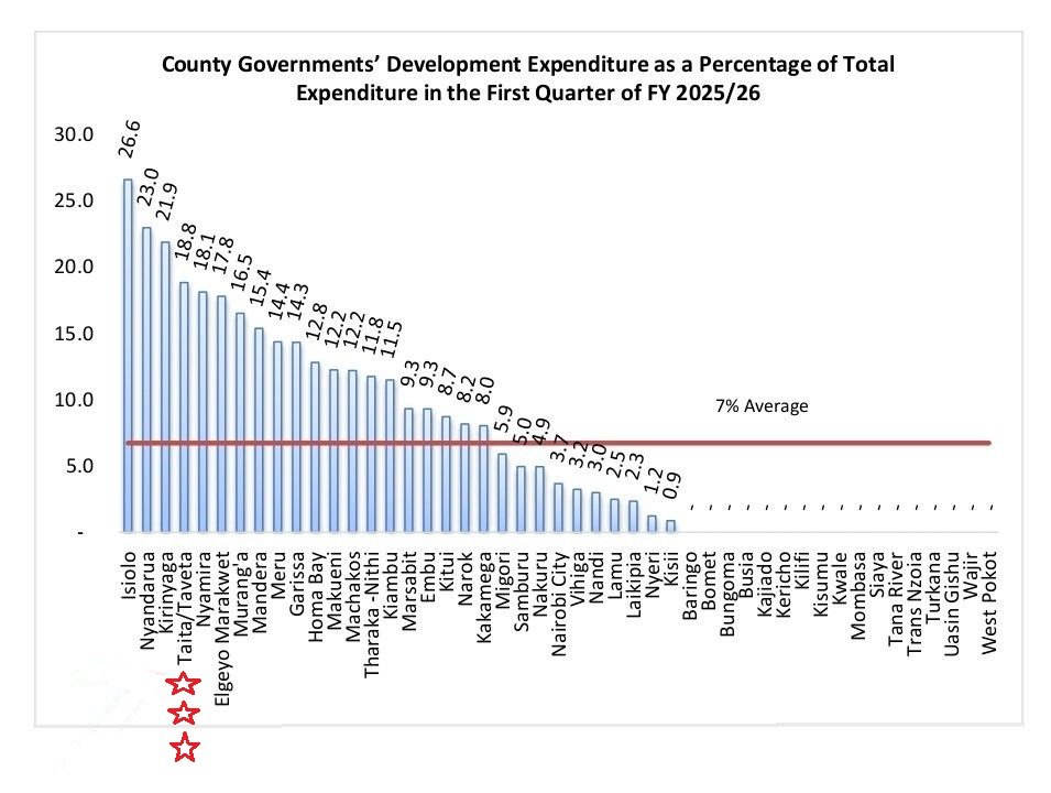 According to the Controller of Budget, Taita Taveta County ranks 4th out of 47 counties in development expenditure for Q1 of FY 2025/26, having allocated 17.8% of its total budget to development projects.